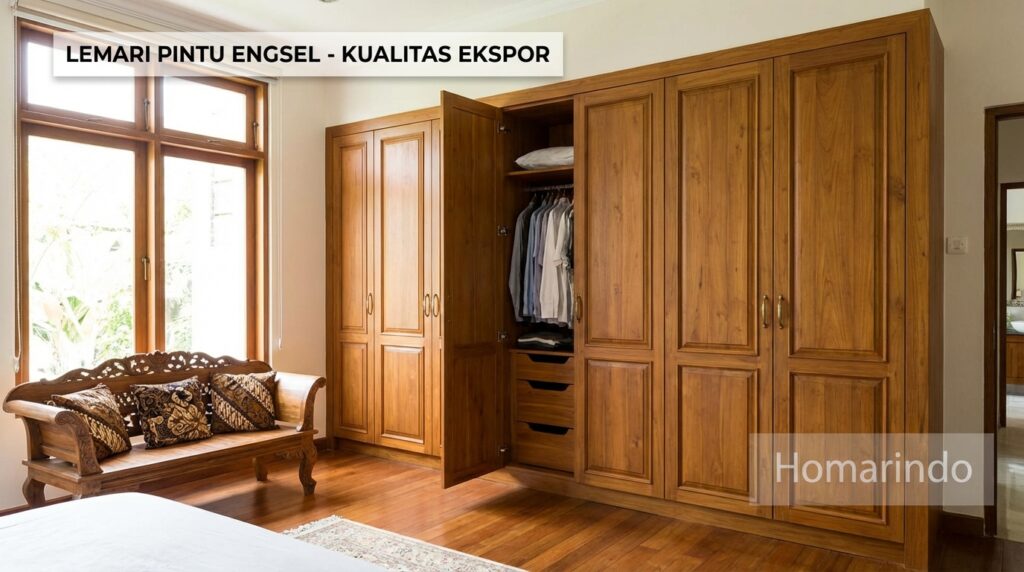 Lemari kayu jati memiliki kelebihan seperti kuat, tahan rayap, awet puluhan tahun, serta memiliki tampilan serat kayu alami yang elegan dan mewah.