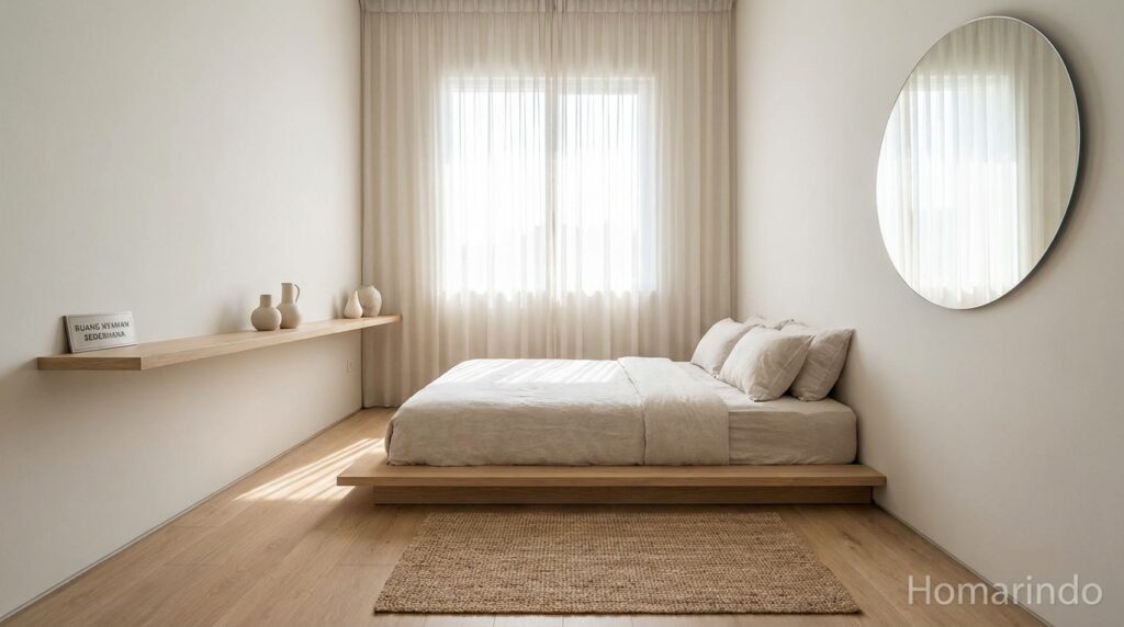 Ukuran tempat tidur yang ideal untuk kamar 3×3 meter adalah single (100–120 cm) atau queen (160 cm) jika ruang diatur secara efisien. Hindari tempat tidur yang terlalu besar agar masih ada ruang untuk berjalan.