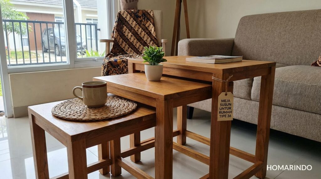 Dengan desain yang serbaguna dan hemat ruang, nesting tables adalah solusi cerdas untuk ruang tamu yang kecil. Penggunaannya memberikan sentuhan fungsional dan estetika yang modern serta memberikan fleksibilitas maksimal dalam menjamu tamu atau mengatur ruang secara efisien sesuai dengan kebutuhan rumah tipe 36.
