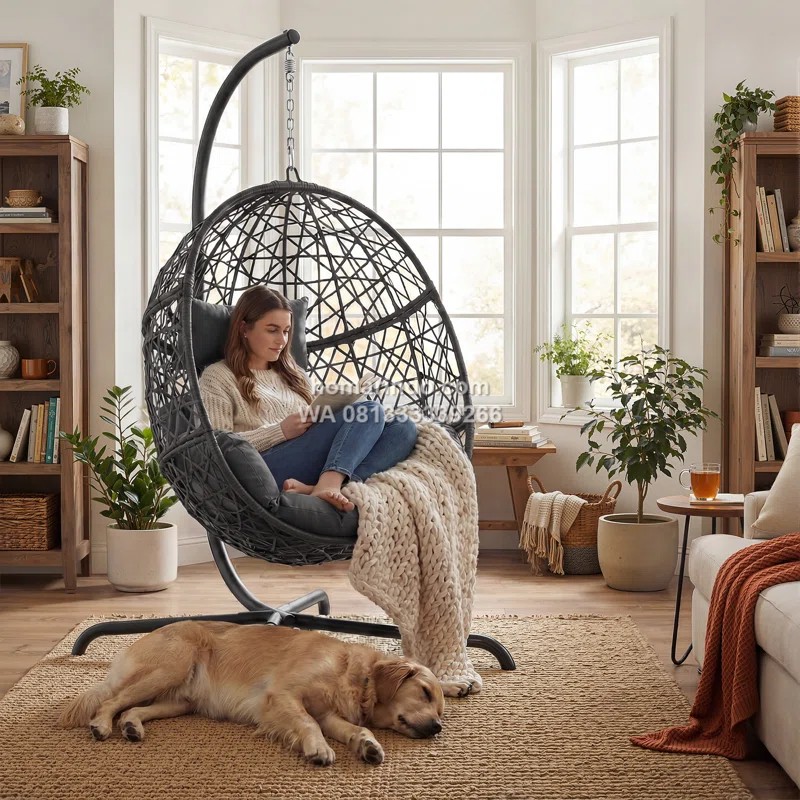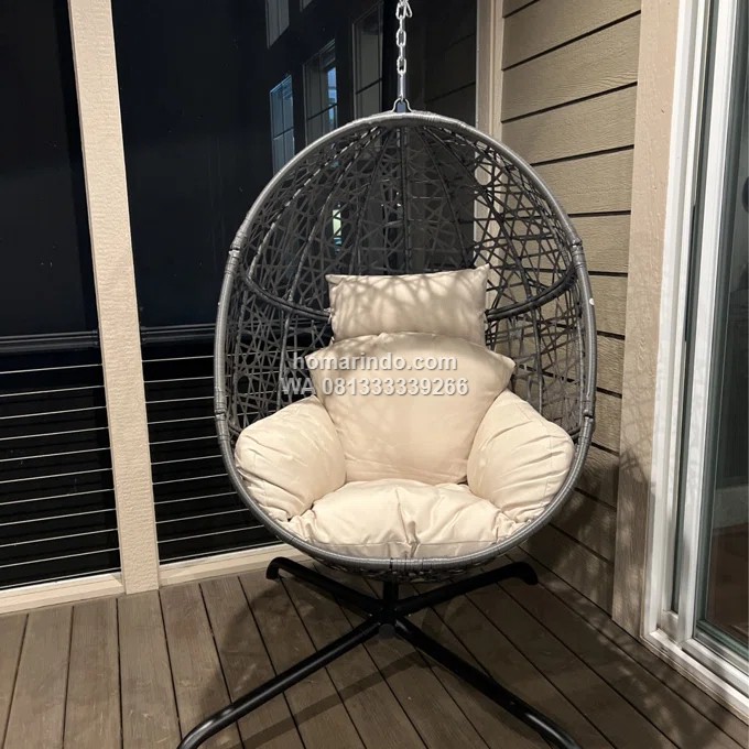 Anyaman rotan sintetis premium memberikan tampilan alami seperti rotan asli, namun jauh lebih awet dan mudah dirawat. Dilengkapi bantalan kain berkualitas yang empuk dan nyaman, ayunan ini menjadi pilihan sempurna untuk bersantai, membaca buku, atau menikmati waktu bersama keluarga.