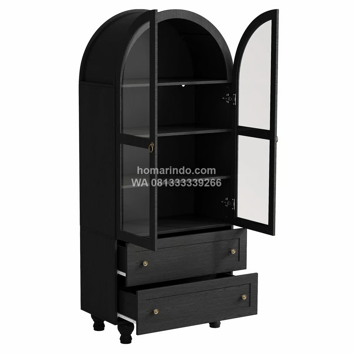 Lemari pajangan elegan berbentuk lengkung dari kayu jati solid dengan finishing melamine halus. Dilengkapi rak dan laci serbaguna, cocok untuk menampilkan koleksi kesayangan di ruang tamu atau ruang keluarga Anda.