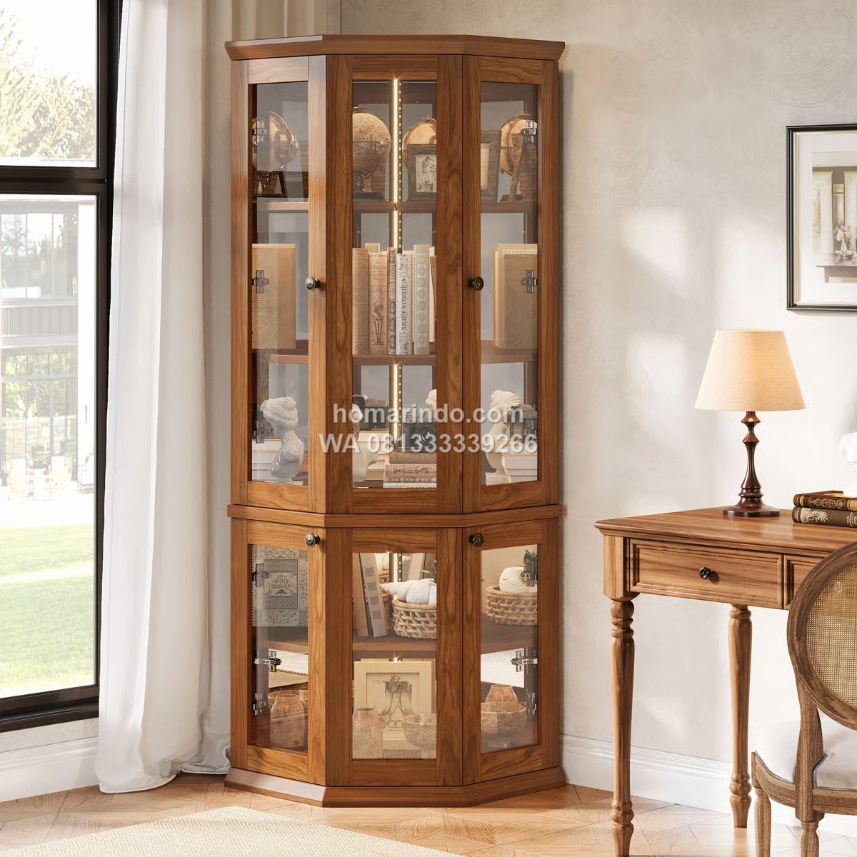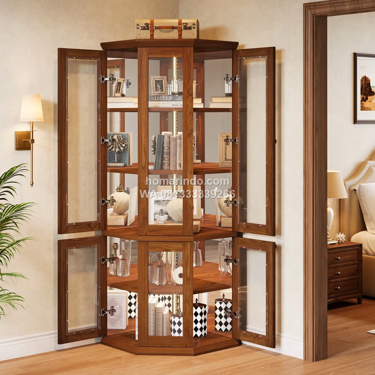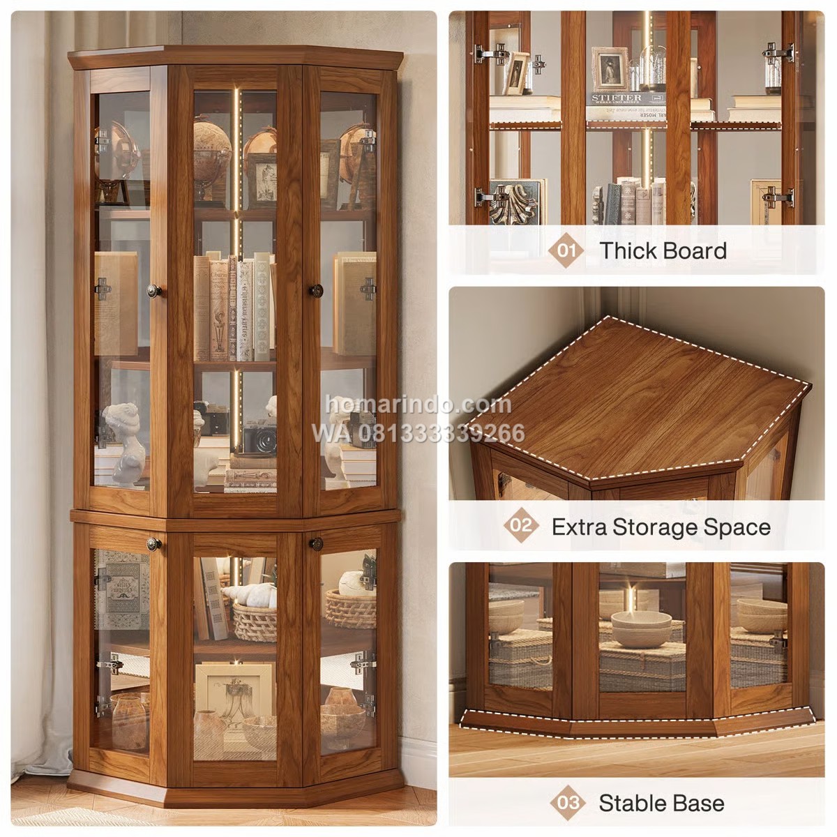 - Model: Lemari Sudut dengan pintu kaca dan rak display