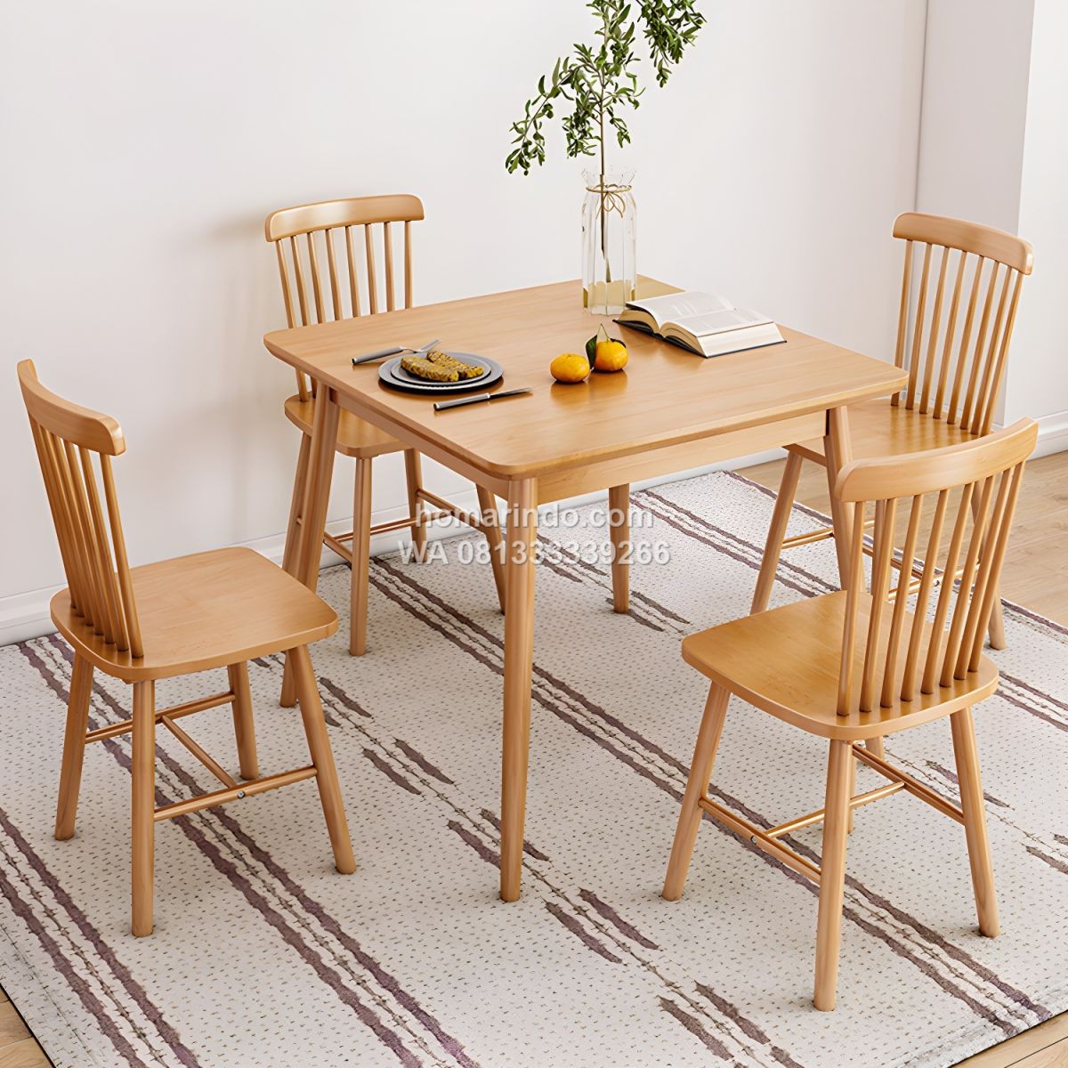 Meja Kursi Cafe Murah berbahan kayu jati solid dengan 4 kursi yang kokoh dan elegan. Finishing melamin halus menampilkan serat kayu alami, cocok untuk cafe, resto, coffee shop, maupun ruang makan minimalis.