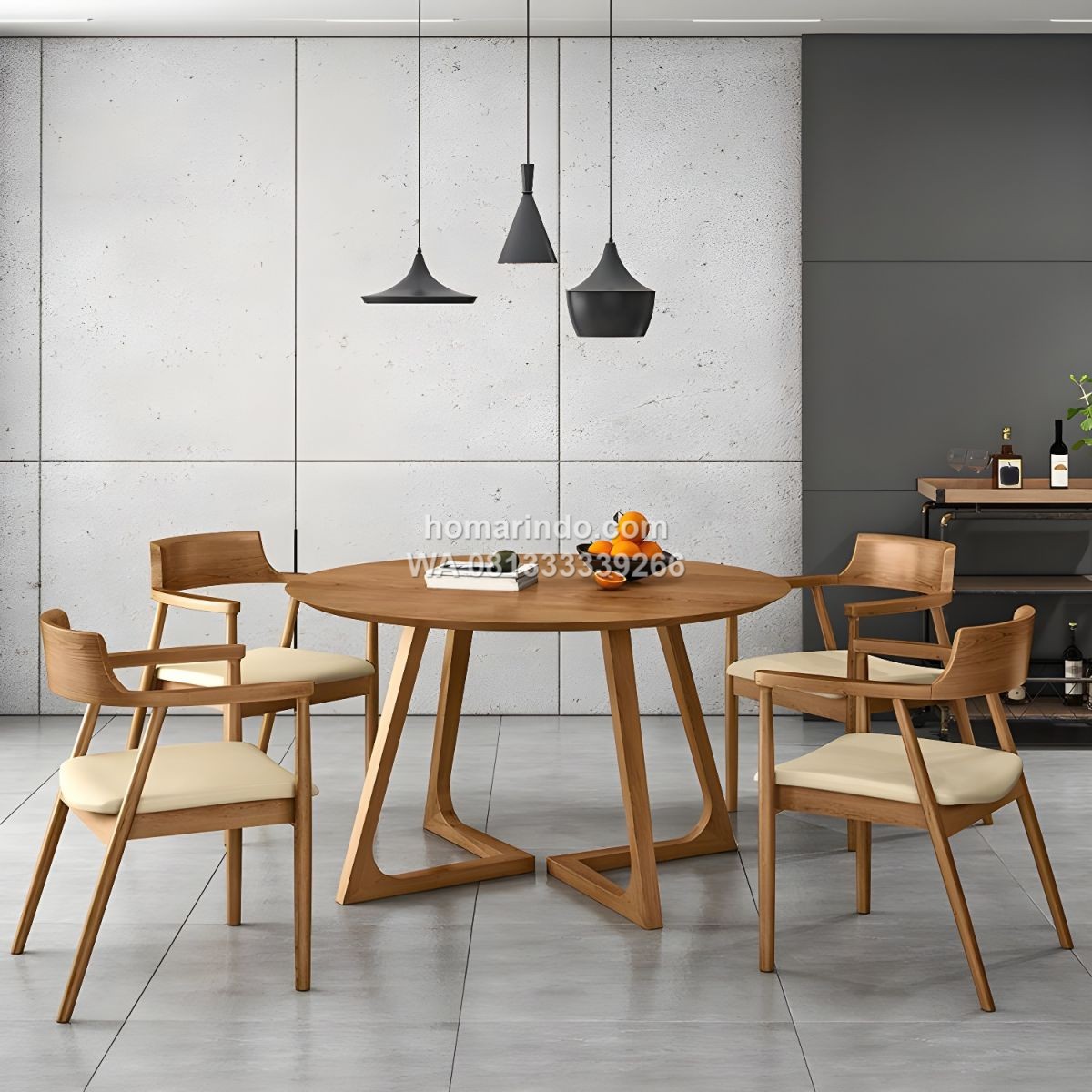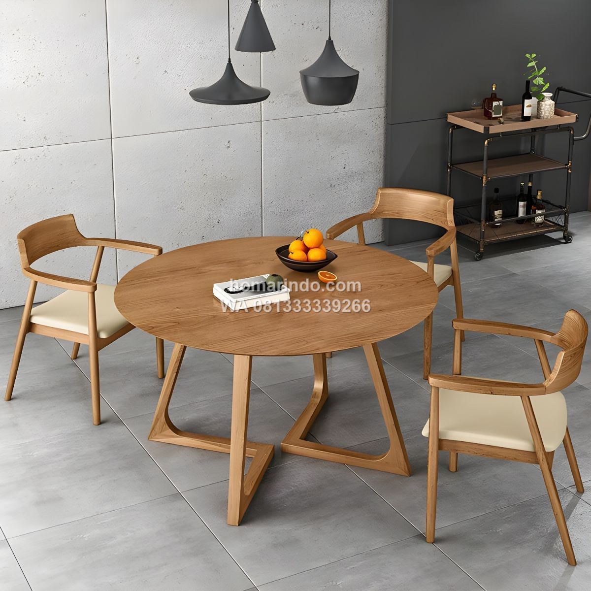 Meja Makan Bundar Modern Minimalis dari kayu jati solid berkualitas tinggi dengan finishing melamin halus. Didesain elegan dan kokoh, set meja makan 4 kursi ini menghadirkan suasana hangat, modern, dan nyaman untuk ruang makan rumah Anda.
