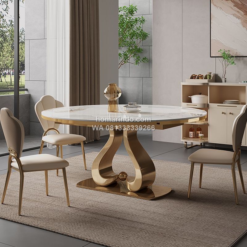 Meja Makan Marmer Bulat Kaki Stainless Mewah Dengan 6 Kursi