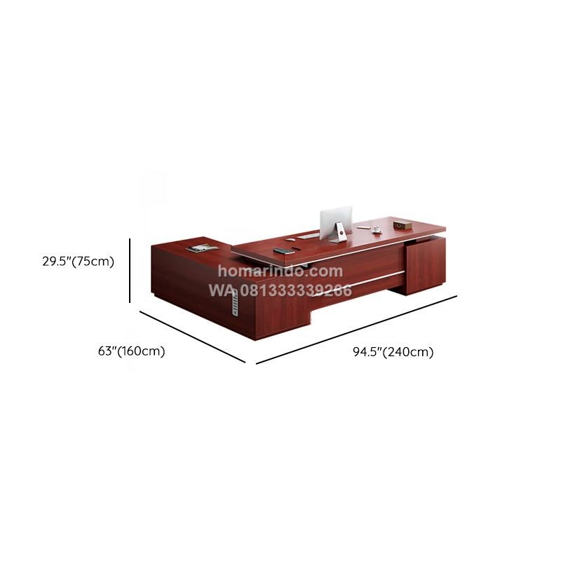 Menggunakan material plywood pilihan yang kokoh serta dilapisi HPL Taco warna merah yang memberikan tampilan mewah dan berkelas. Kombinasi warna yang tegas ini menjadikan meja cocok untuk ruang pimpinan, direktur, owner, maupun manager yang ingin ruang kerja terlihat lebih berwibawa.